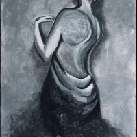 Denne stemningsfulde skildring af en kvinde set bagfra indfanger et øjeblik af ro, ynde og introspektion. I afdæmpede gråtoner og bløde penselstrøg fremhæves kroppens naturlige bevægelse og elegance – en hyldest til det stille øjeblik midt i dansens rytme.